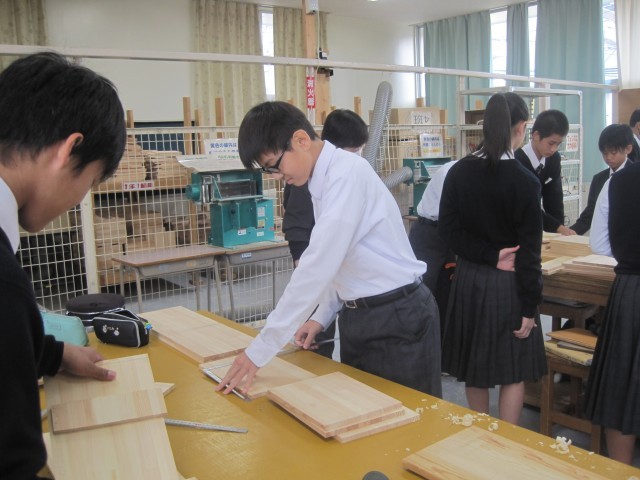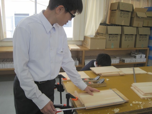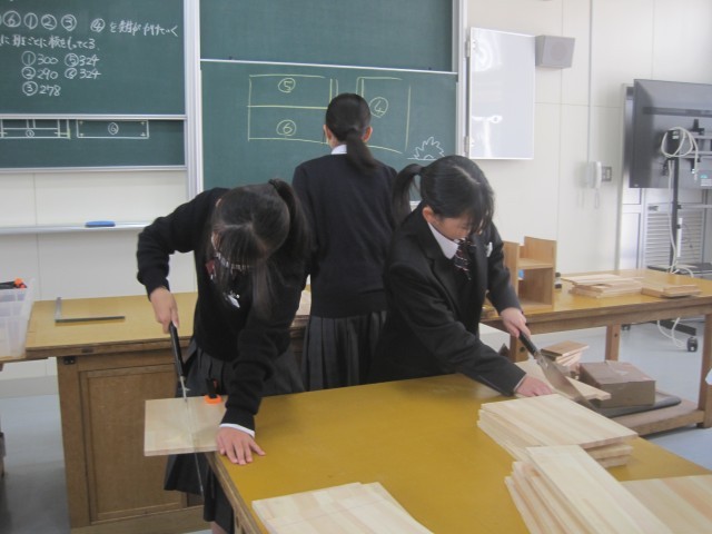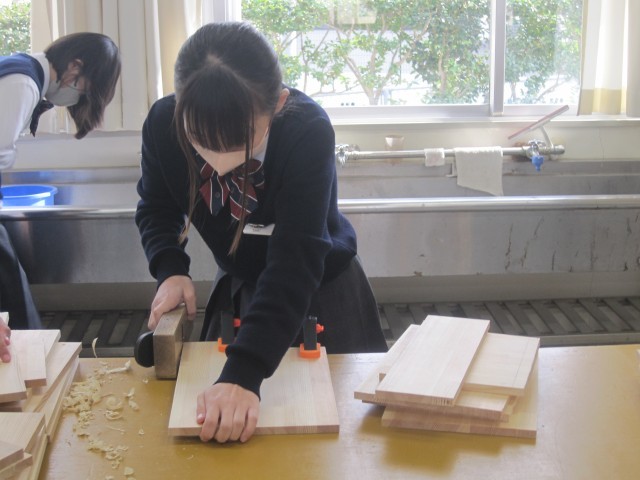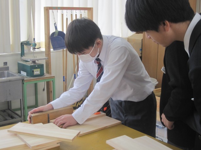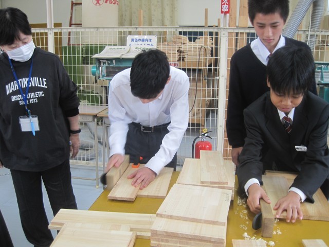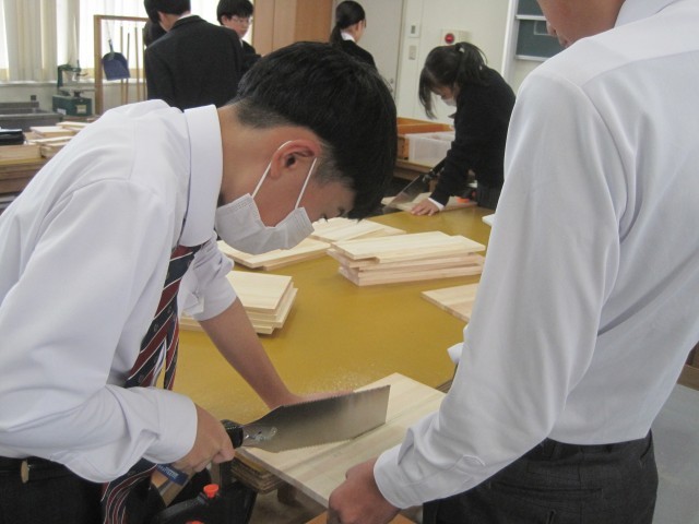 1年2組の技術の授業では、のこぎり、鉋を使い、作業しました。板を抑えていた生徒さんが、のこぎりを引いている生徒さんに「半分切れたよ!」と励ます場面が!