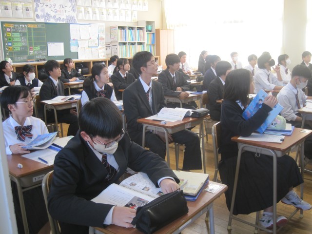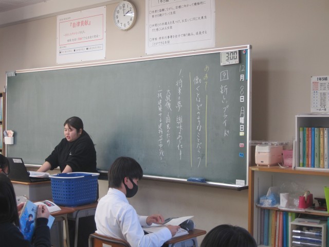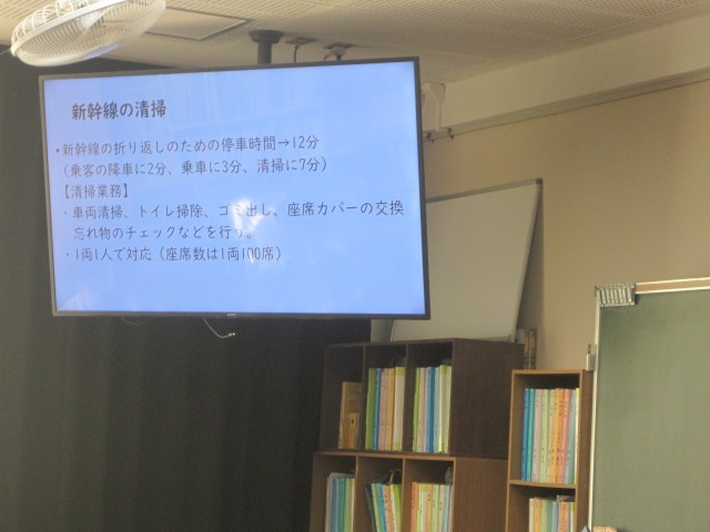 1年5組の道徳の授業では、「新しいプライド」という教材をもとに働くとはどういうことかを考えました。まず、新幹線の清掃について話がありました。興味をもって考えることができる導入でした。