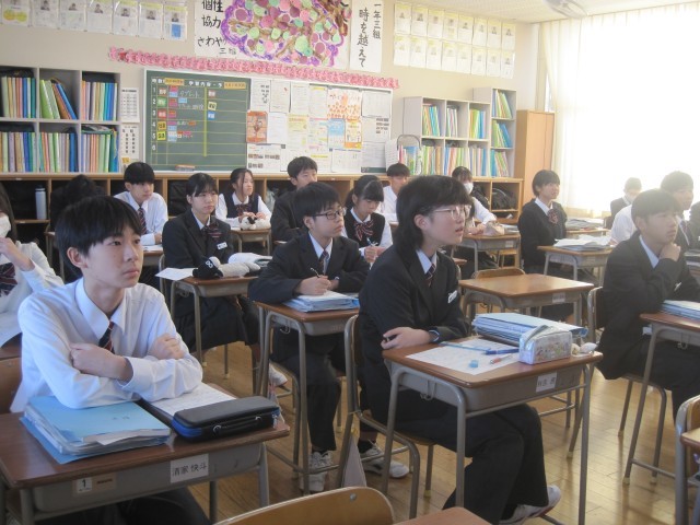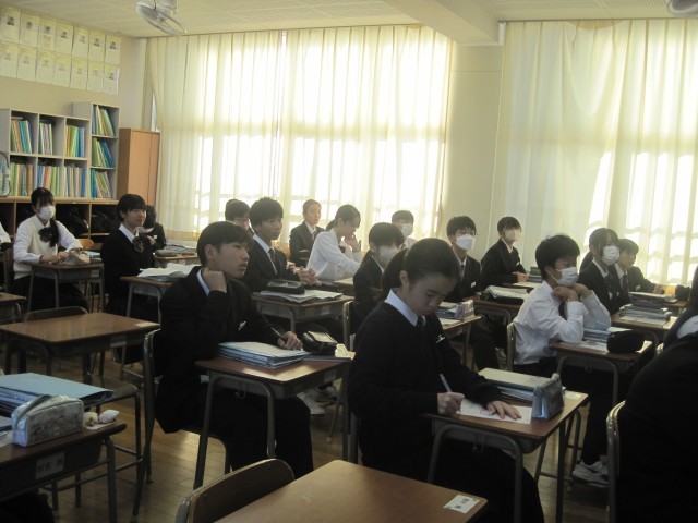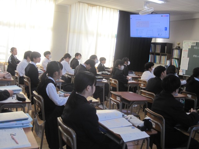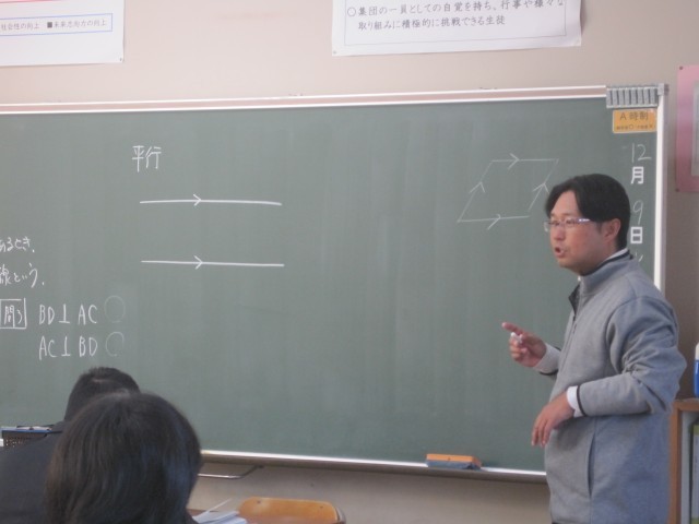 1年3組の数学の授業では、図形の学習をしました。それぞれが平行の関係の図形を用い、応用していきました。先生の説明を真剣に聞いています!