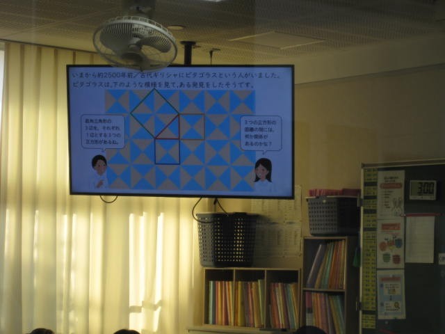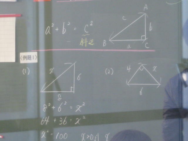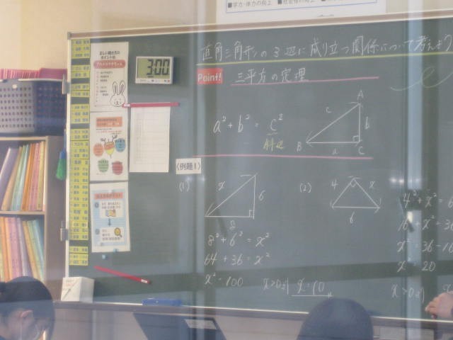 3年1組では、数学の授業で「三平方の定理」を学習していました。「ピタゴラスの定理」とも言われ、数学では有名な定理です。先生の話をしっかりと聞きまじめな雰囲気で学習に取り組んでいました。さすが3年生!!という雰囲気でした。