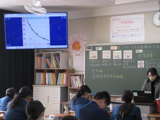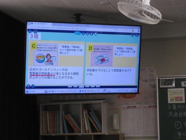 本日4限目に3年4組で社会科の授業が行われました。モノやサービスの値段はどうやって決まっているのかを学習しました。「需要量」と「供給量」の視点から考えました。グループ学習では、「ゴールデンウィークや正月などのホテルの値段が高くなるのはなぜ」「閉店間際の生鮮食品が値引きされるのはなぜ」などを話し合いました。グループで活発に意見交流が行われていました。