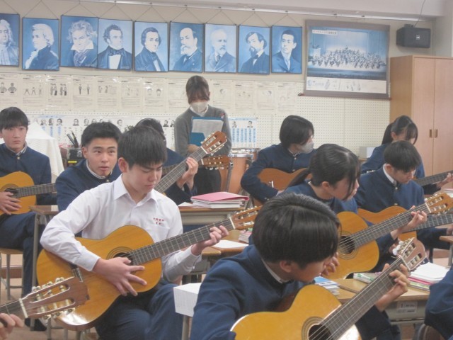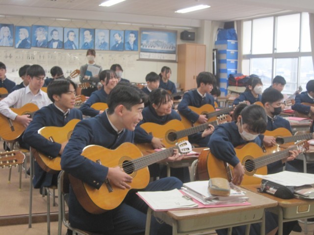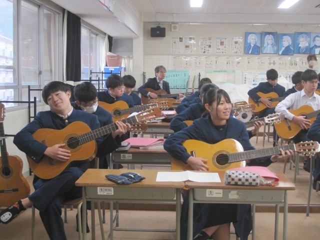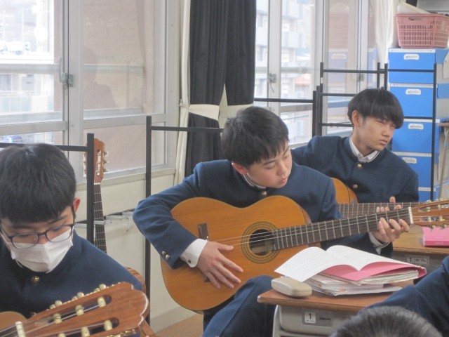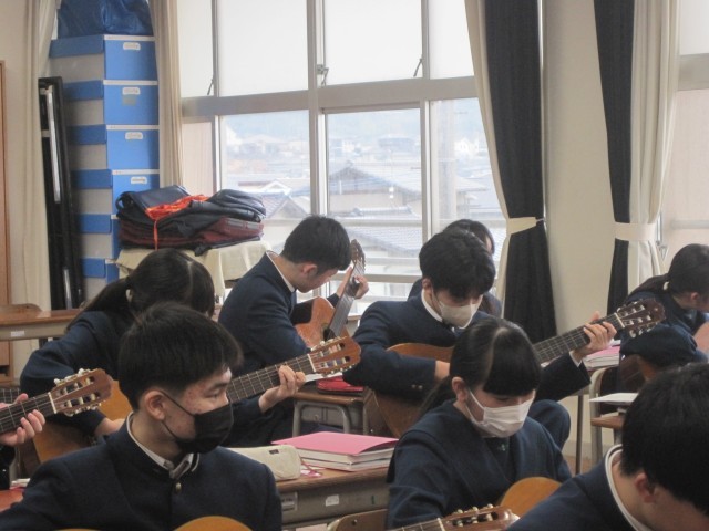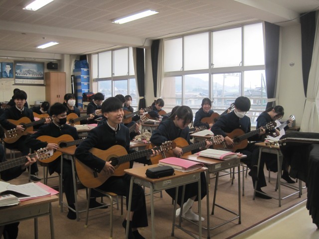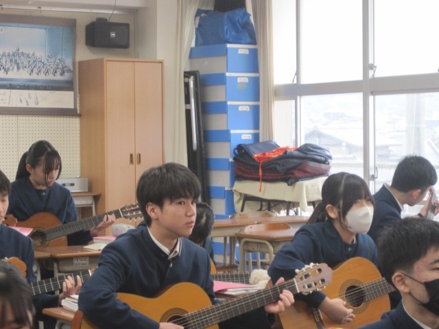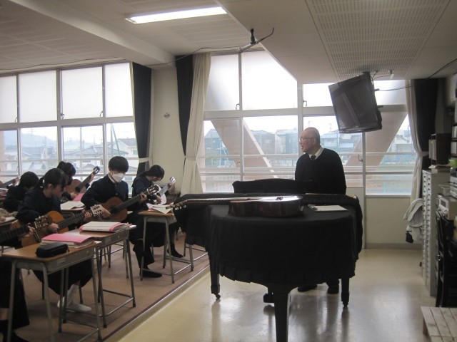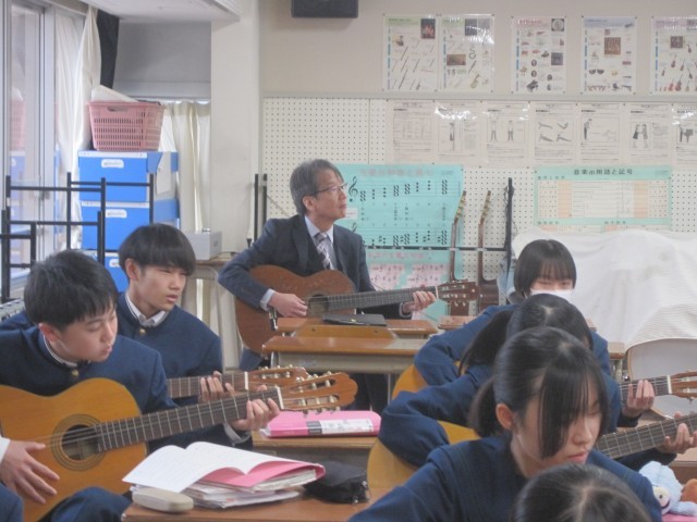 12月18日(木)、3年7組の授業では平田先生の授業研修が行われました。ギターを演奏している中、後ろには何と校長先生が演奏を!!