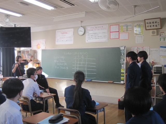 12月22日(月)3年4組では、小田先生が示したお題をもとに、ALTのマット先生に伝えるゲームを行いました。そのものずばりを英語に直すのではなく、ヒントを与えて答えてもらうというものでした。「雪だるま」というお題を見て、«snow»、「アナユキ」…と答えが続きます。先生から「アナユキは日本語」と言われ、次のヒントを考えました。