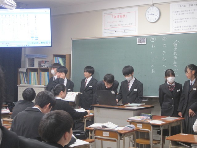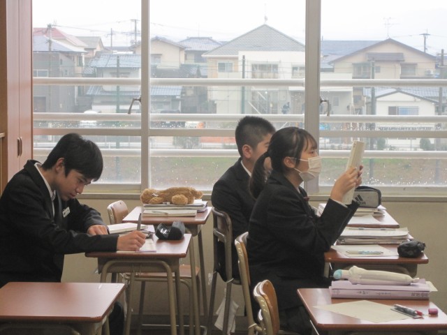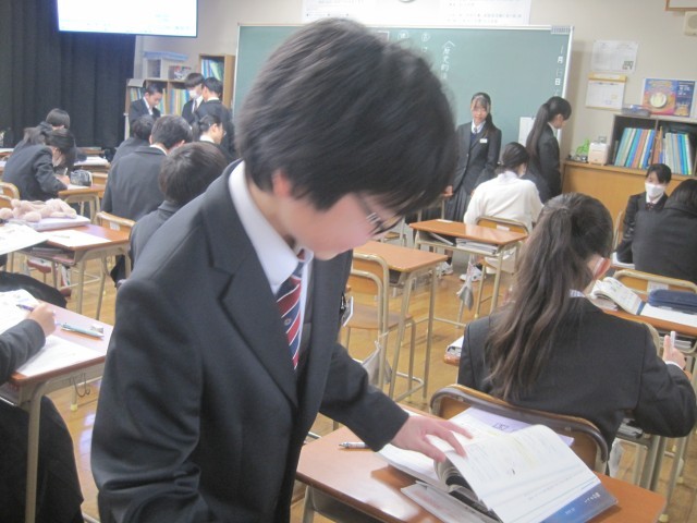 1月13日(火)、1年6組の国語の授業では、『竹取物語』冒頭部分の暗唱テストが行われていました。待っている間も、練習に励む生徒たち。「自信があるようだね」と言うと、笑顔でした。