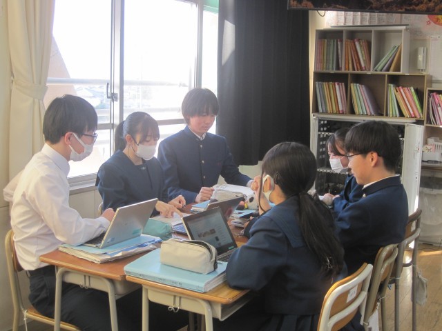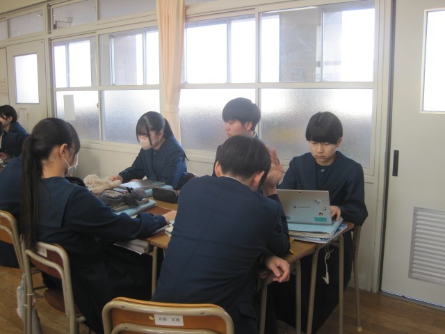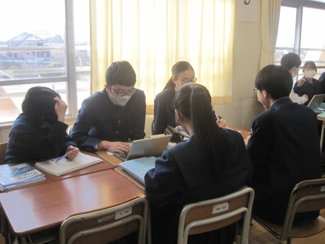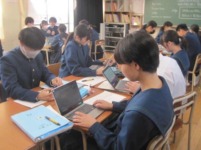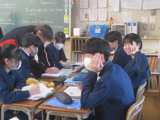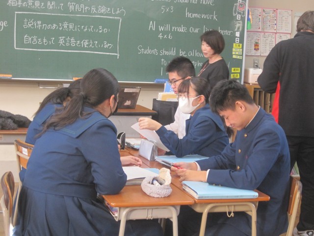3年4組の英語の授業では、説得力のある意見を述べるために、ALTのマット先生に尋ねたり、タブレットで調べたりして、英文をつくりました。