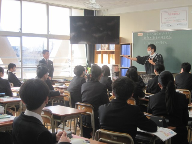 1月21日(水)、2年生は道徳の授業を行いました。写真の1枚目の6組では「僕は知りません」をどのように言うのかを実演しました。
