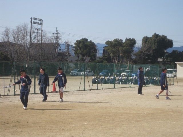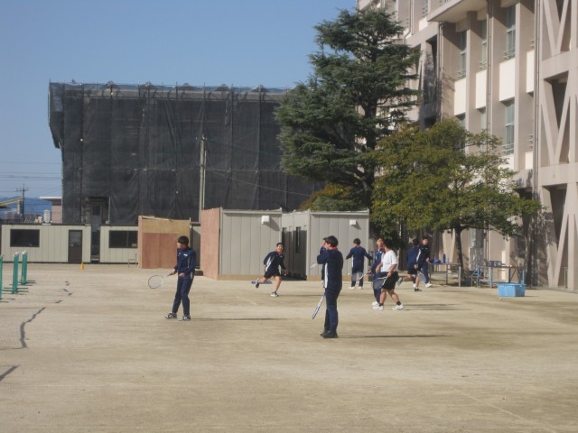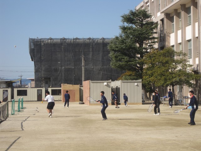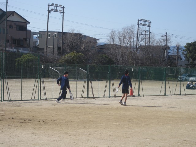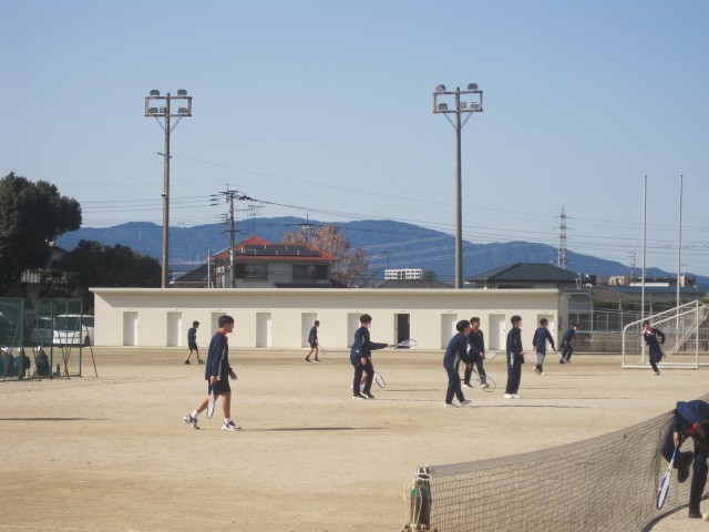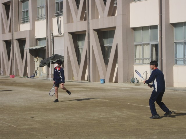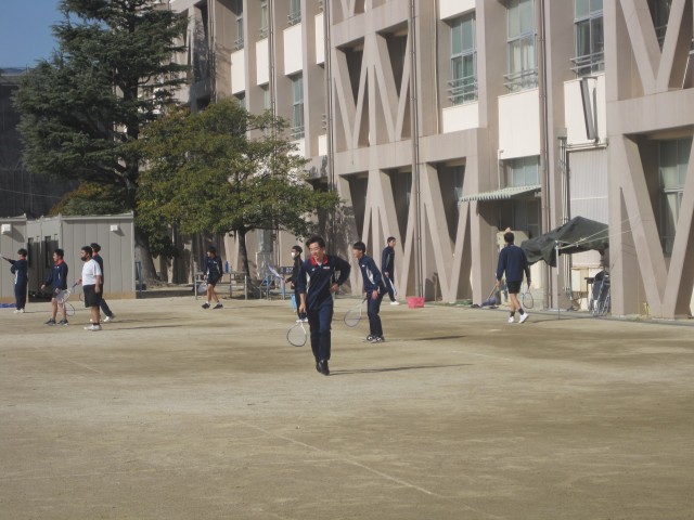 3年5,6組の男子の保健体育はソフトテニスの授業でした。「うわー!」と元気な声が響きました。楽しそうにラリーを続けています!
