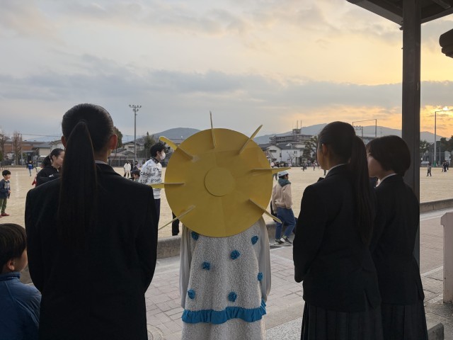 大野北小学校のマスコットキャラクター「北ヤン」とともに、小学生の元気いっぱいな声に負けないように中学生も一緒に登校する児童の皆さんを出迎えることができました。