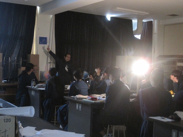 カーテンを閉め切り、暗い理科室から先生の声が聞こえます。「?」のぞいてみると、3年4組の理科の授業が行われていました。星座の授業で、真ん中にライトが一つだけつけられ、幻想的な雰囲気の中で学習が進みました。