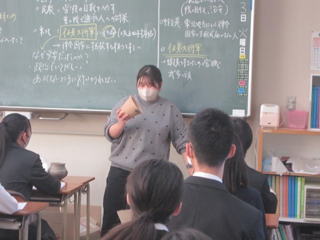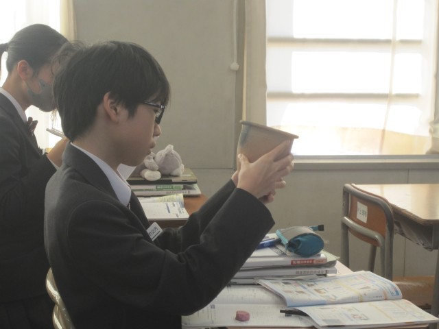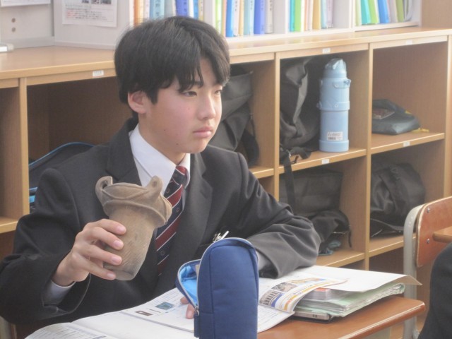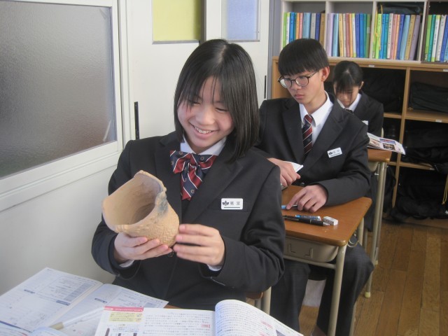 1年5組の社会の授業では、弥生式土器(レプリカ)を手に取り、文様などを確かめました。黒い部分を見つけ、「焦げたんじゃない?」「カビ?」目の付けどころにびっくりです!
