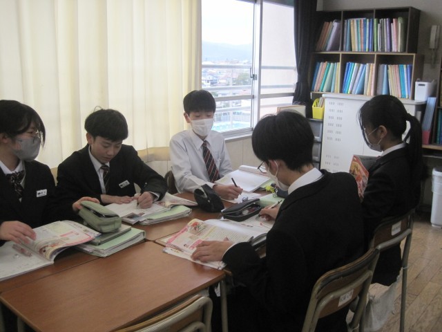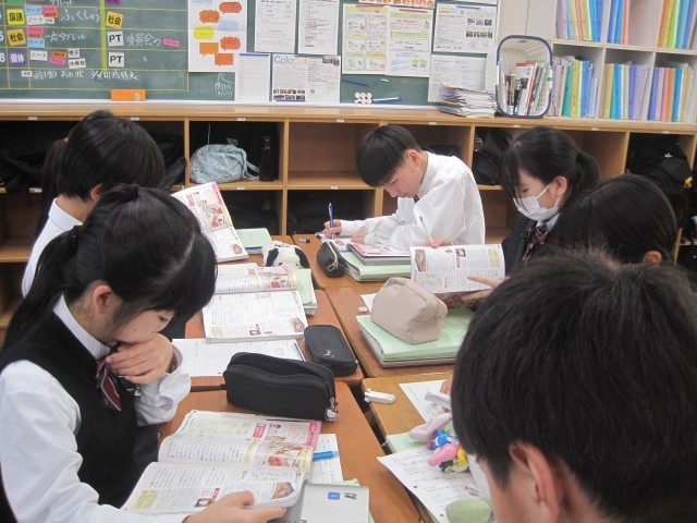 1年3組の社会の授業では、平安時代の政治の特徴をまとめました。班での学習でしたが、生徒の皆さんは黙々と学習を進めます。藤先生が「教え合っていいよ~」と呼びかけますが、黙々…。集中して学習に取り組みました。
