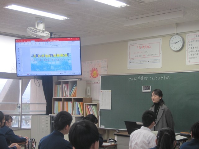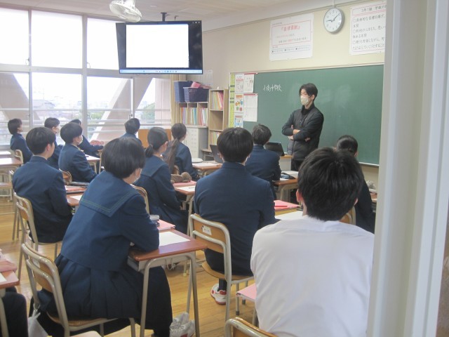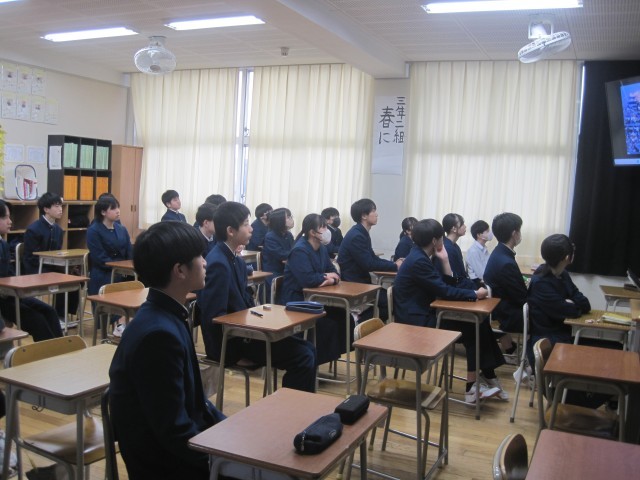 3年生は道徳の授業で、卒業式歌の「群青」の背景を考えました。「群青」は東日本大震災で亡くなった級友たちの言葉をもとに誕生したものです。背景を知ると、その曲の重みがよく分かったと思います。