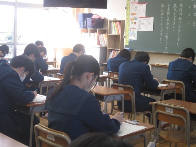 2月18日(水)、定期テストⅣ最終日です。中学校で受けるテストの最終日でもあります。3年生は①数学、②理科、③美術の順で最後のテストを行います。残り3教科、頑張ってください!