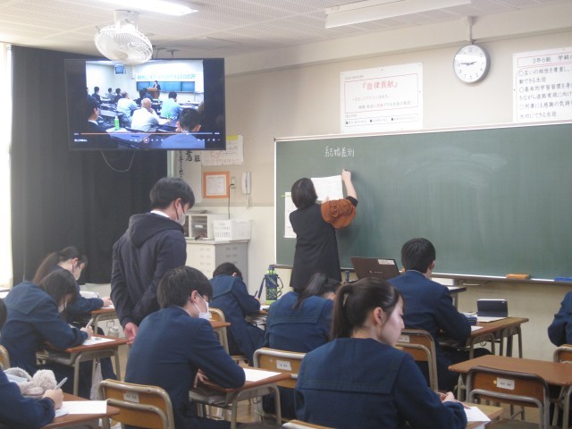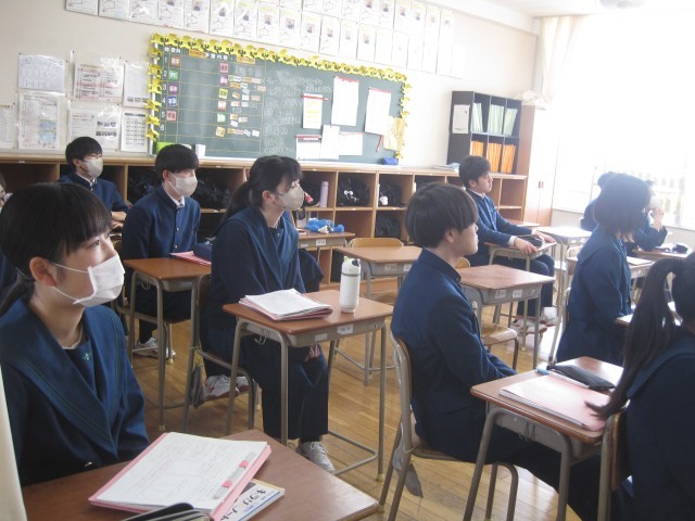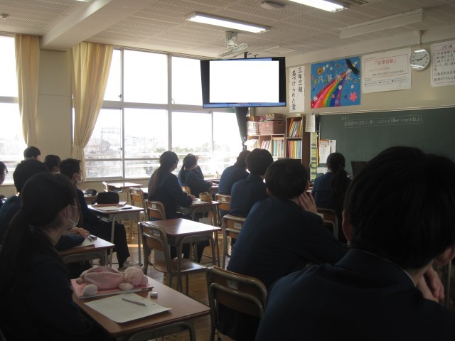 2月24日(火)、3年生は人権学習の続きを行いました。当事者の思いを知るために、動画を視聴しました。動画を視聴する3年生の皆さんの顔はとても真剣です。