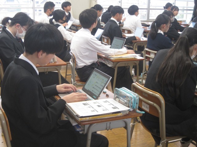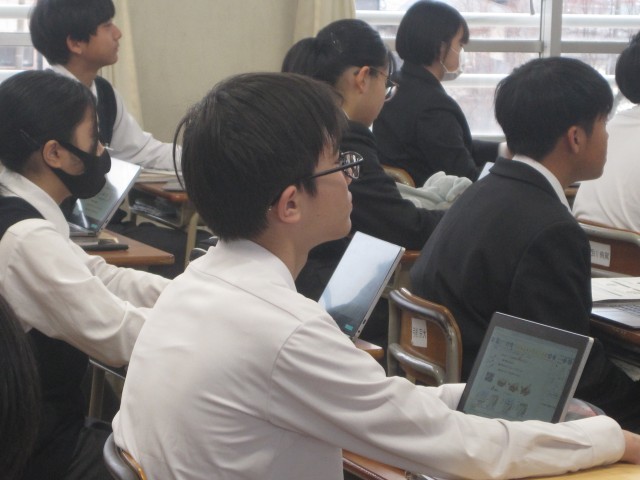 1年4組の理科の授業では、地層の学習をしていました。タブレットそしてテレビ画面を見比べ、先生の話をしっかり聞いています。日髙先生から「これは次の時間に~」と、次の授業につながる説明があり、単元の流れがしっかり意識された授業でした。