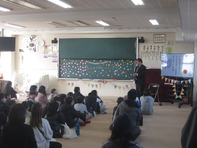 2月26日(木)に大野東中ブロック特別支援学級交流会を多目的室で行いました。黒板だけでなく、入り口にまで飾りつけが行われ、心のこもったおもてなしができていました!その後、校内見学を行いました。新入生の皆さんの入学を楽しみに待っています!