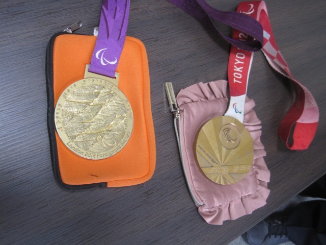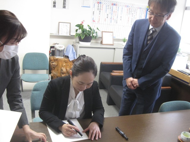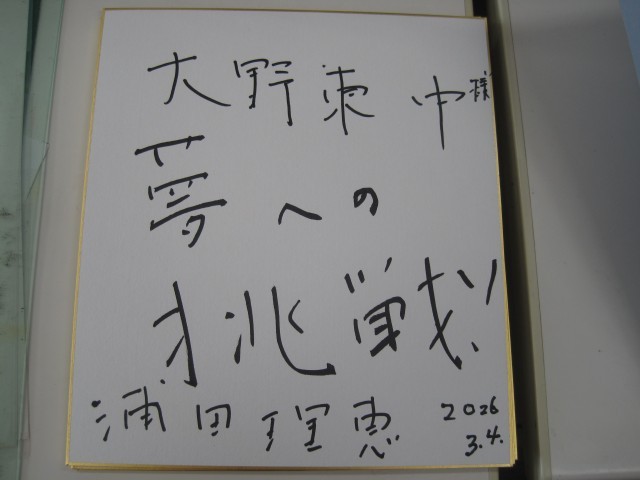 夢講座終了後、校長室で学校にサインをいただきました。色紙に文字数が入るかを考え、書いてくださいました。シーズアスリート事務局の草野様が、失明前に書いていた字を思い出して浦田様が書かれることを教えてくださいました。