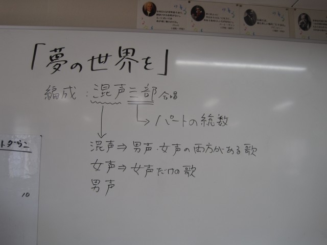 1年6組の音楽の授業は、「夢の世界を」の合唱練習でした。パートごとに分かれ、練習を行いました。合わせて練習する日も近いのでは?