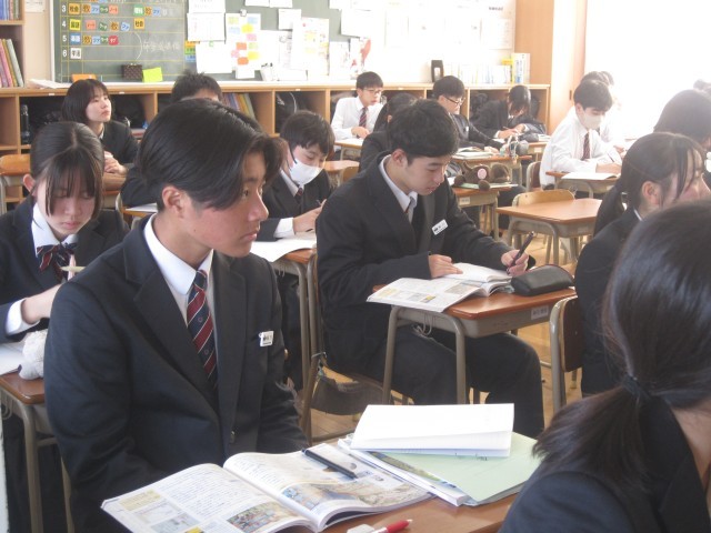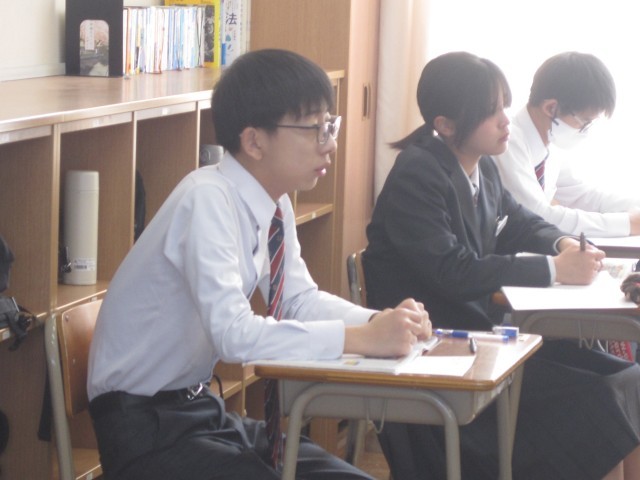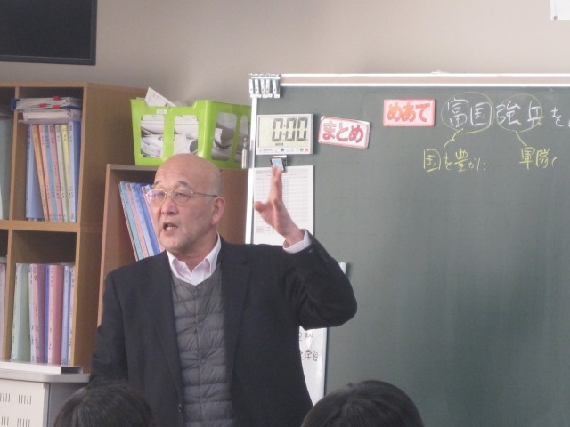 2年4組の社会の授業では、富国強兵に関する授業でした。導入でガソリンの値上げについて時事に関する話がありました。とても静かに先生の説明を聞いていました。