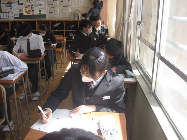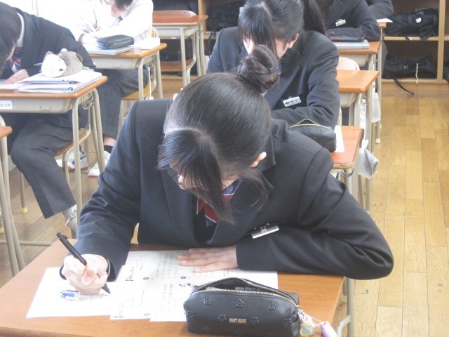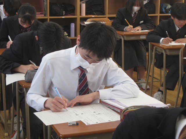 2年3組の国語の授業では、行書のまとめとして硬筆の練習を行いました。前回は「いろは歌」を練習し、今回は『枕草子』の冒頭部分を練習しました。いつも賑やかな3組ですが、本日は超真剣!黙々と練習に励みました!出来上がった作品を見ると、皆さん、とても上手です!!