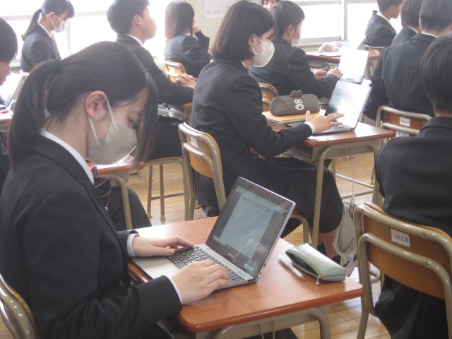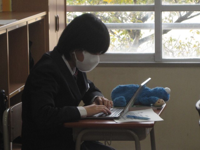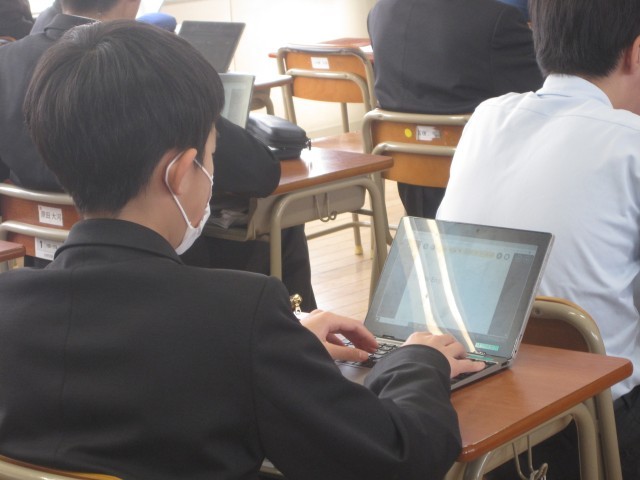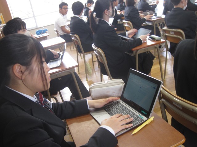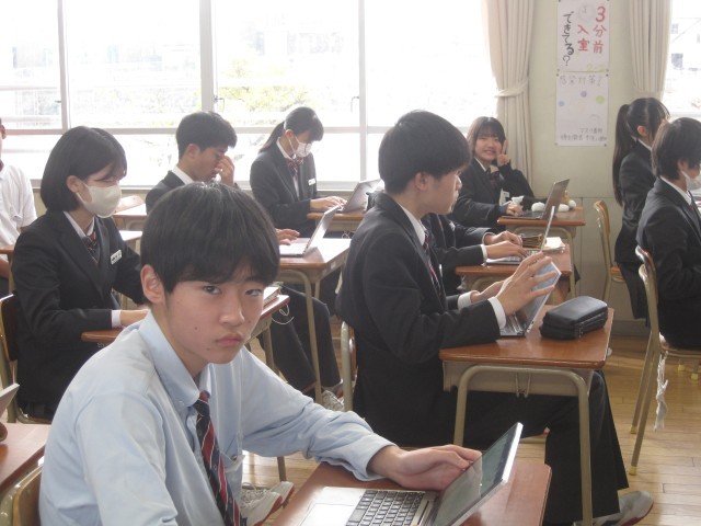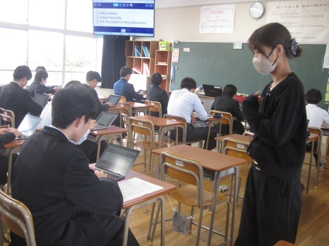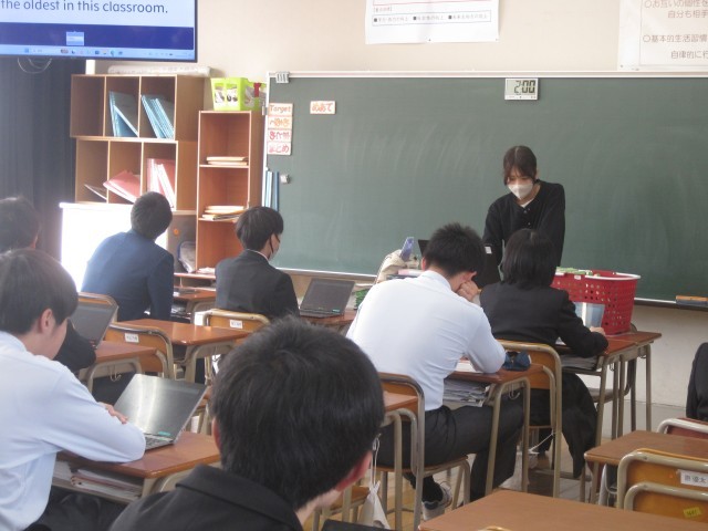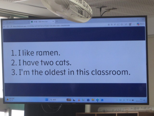 2年2組の英語の授業では、3文ヒントクイズを作りました。菊池先生が例文の3文目"I'm the oldest in this class. »を読み上げた瞬間、何人か一斉に振り返り、私を見ました……。