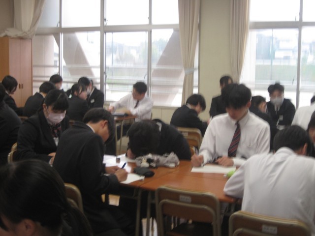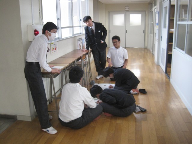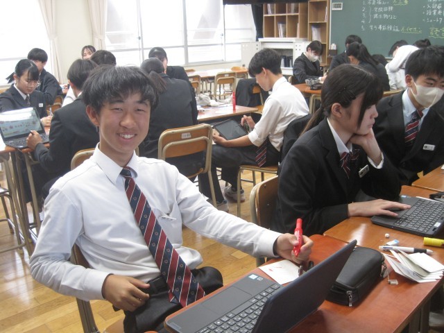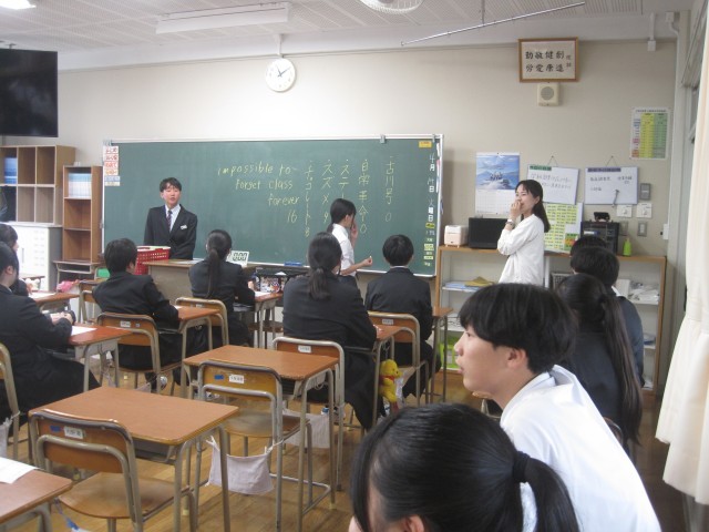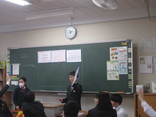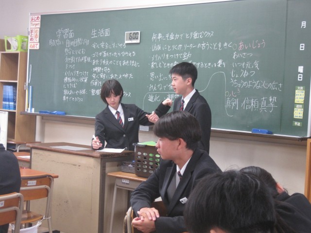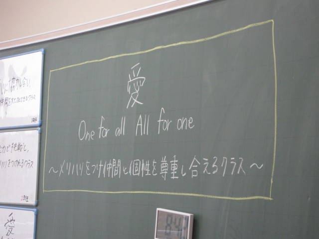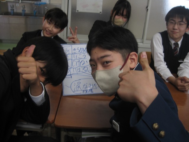 3年生は学級目標を決めていました。3年4組は決まった学級目標を一人ひとり描き、視覚化しました。7組は早速模造紙に描き始め、自己紹介カードを提示していました。休憩中に棚の上でポーズを決めてくれた生徒さんもいました!