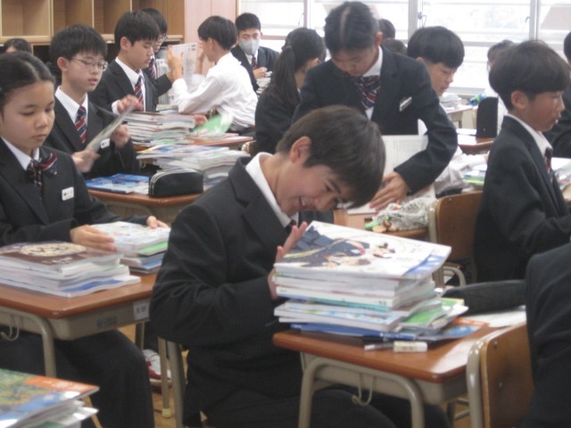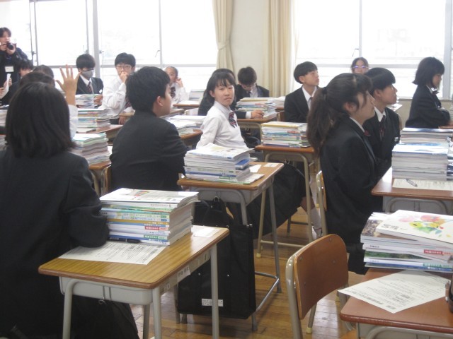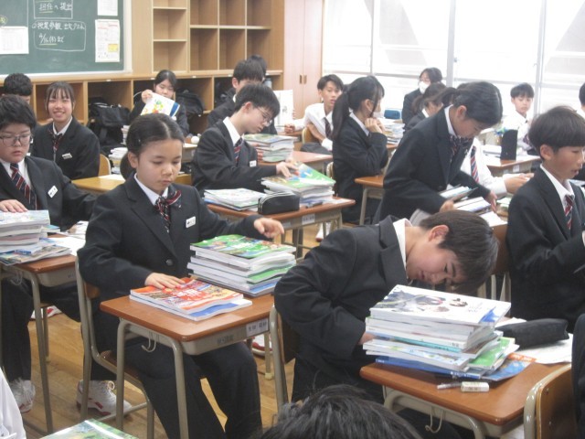 1年生は教科書が配付されました。積み重ねられた教科書の山を見て驚いた人もいたようです。これから1年間、しっかり学習に励みましょう!