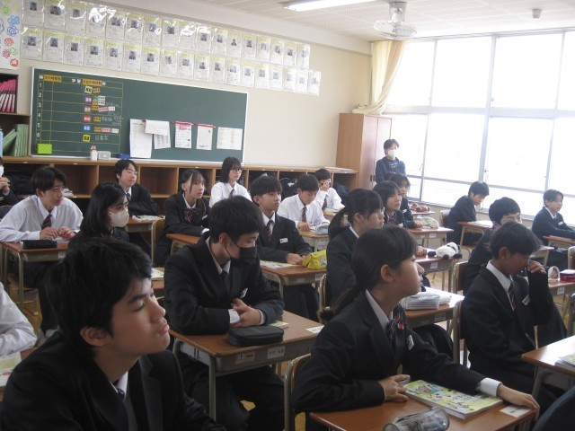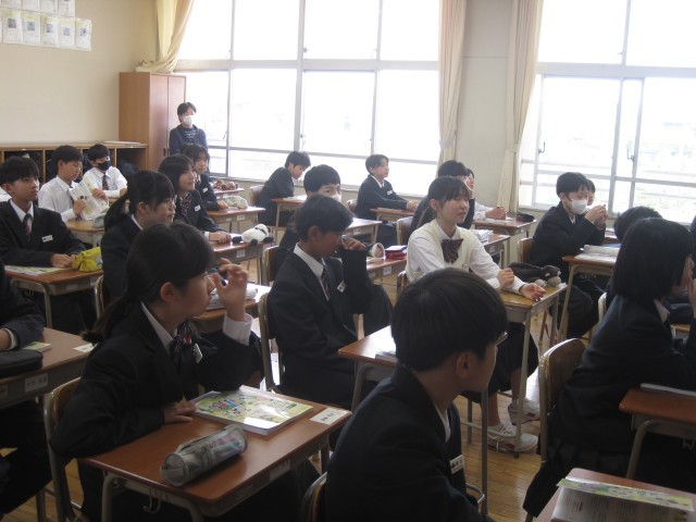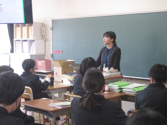 1年2組では初めての家庭科の授業でした。先生の自己紹介からスタートです!先生たちの名前をもう覚えましたか?