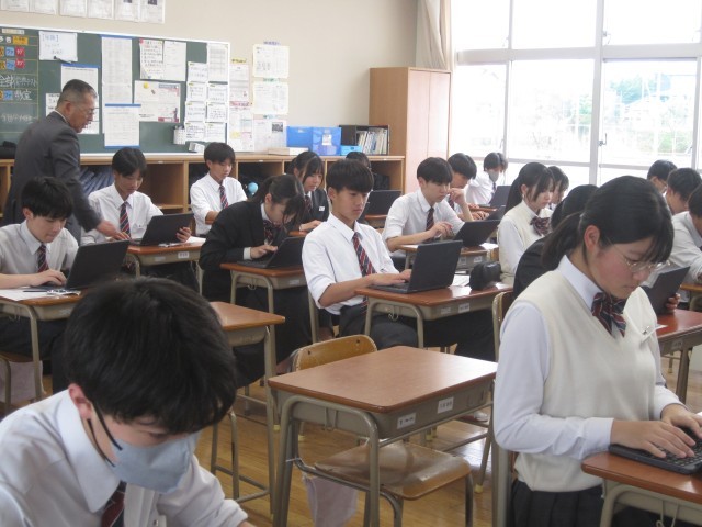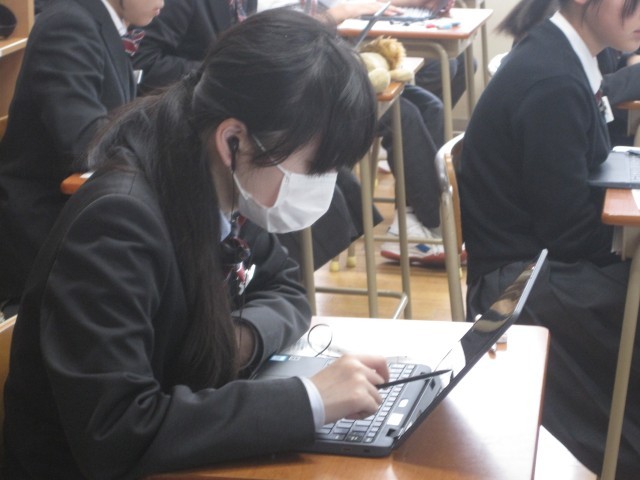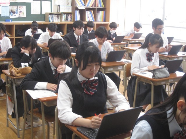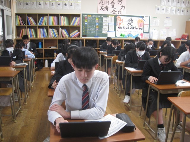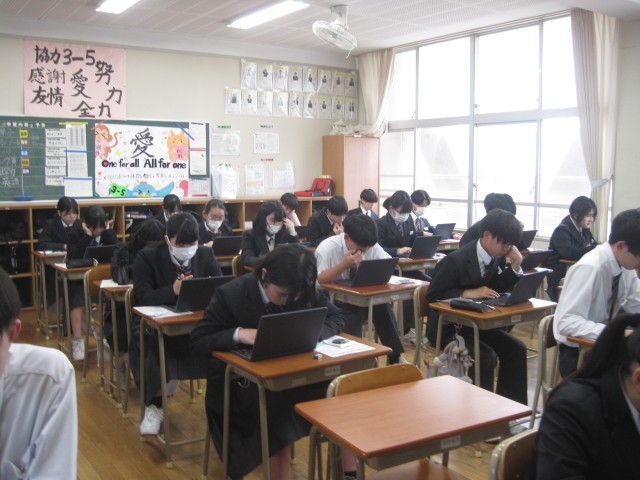 3年生は5,6校時に全国学力・学習状況調査の第1回目を行いました。本日は、英語(技能)、質問紙回答です。