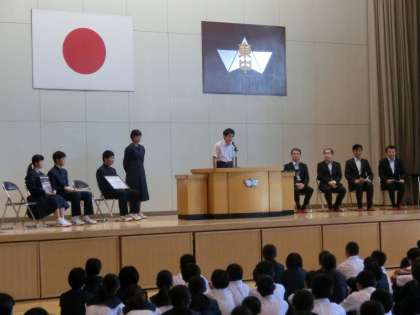 本日10月29日(月)1時間目、体育館において、夏休み8月23日に行われた、市の中学生模擬議会に参加した生徒に、市議会から感謝状の贈呈式が行われました。市議会から、関井利夫議員、松崎正和議員、井上正則議員、河村康之議員、森和也議員、松下真一議員の6名が来校し、感謝状・写真等の贈呈や模擬議会の中での質問に対する回答をしていただきました。
