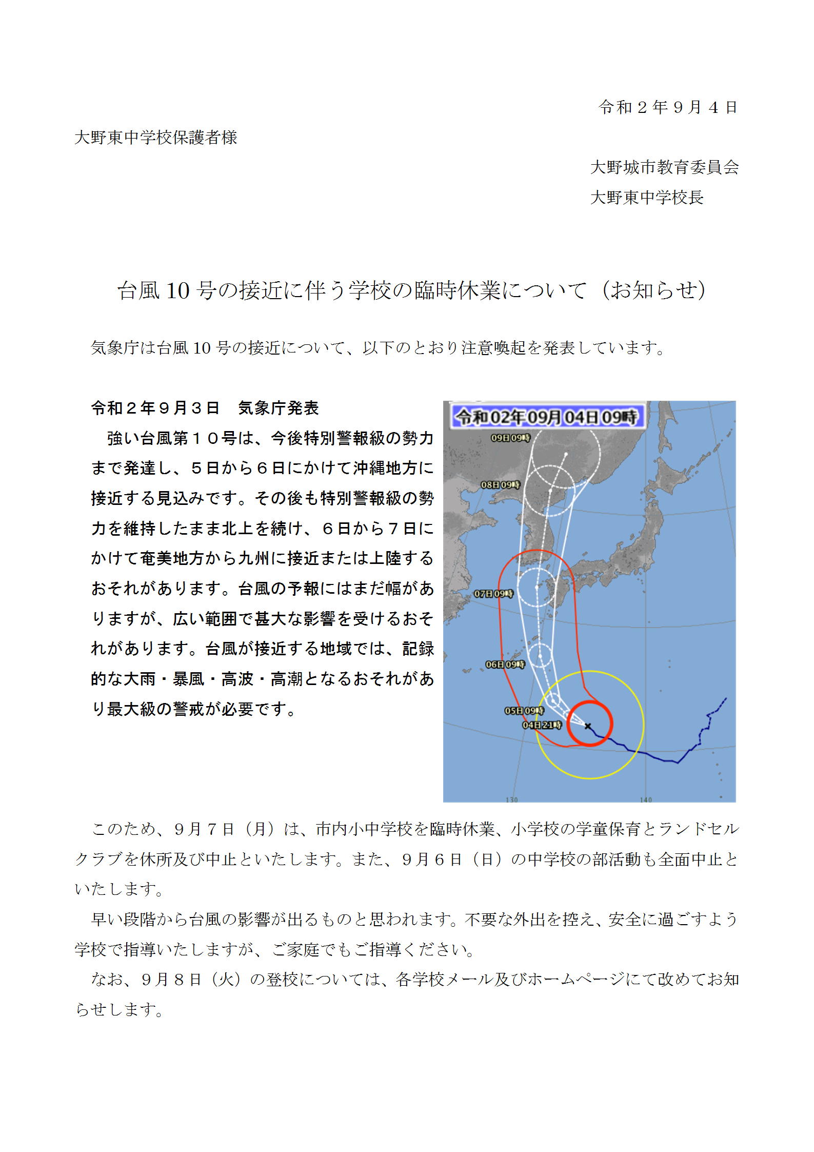 配付文書「台風10号の接近に伴う学校の臨時休業について