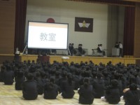 1年2組の美術の授業では、雲定規を使っていろいろな曲線を描きました。初めて手にする雲定規。渡された途端、手に握って嬉しそうな表情の生徒たち。先生からどのように使うのかを示してもらいました。先生が分かりやすいように、始めと終わりに合わせ「ウィーン、ガチャン」と言ったのを真似ていました。