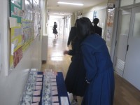 職員室前の廊下に3年生の美術作品が展示されていました。昼休みということもあり、3年生、2年生数名が鑑賞していました。一人ひとりの作品がケースに入れられており、重厚感が出ています。