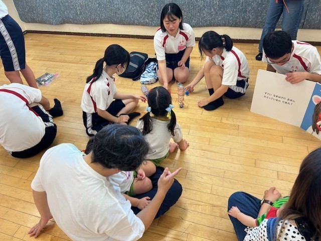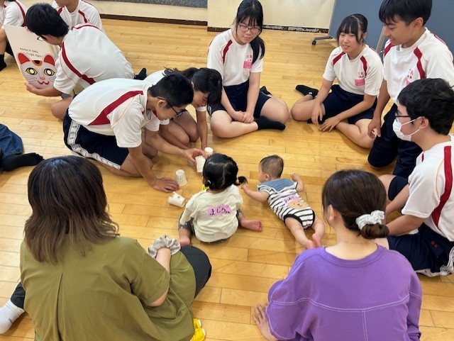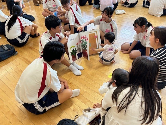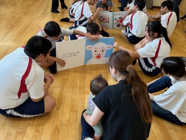 実際に子育て中の方に自分のお子様を連れてきていただき、中学生が絵本を読んだり、遊び道具を用意したりして、子どもと交流するものである。また、保護者の方に育児のことを質問したりなど、自分たちの育ってきた過程を思い出したり、将来育児をする際の予習になったりと生活に密に関係してくるものなので、中学生にとってはとても勉強になる内容である。