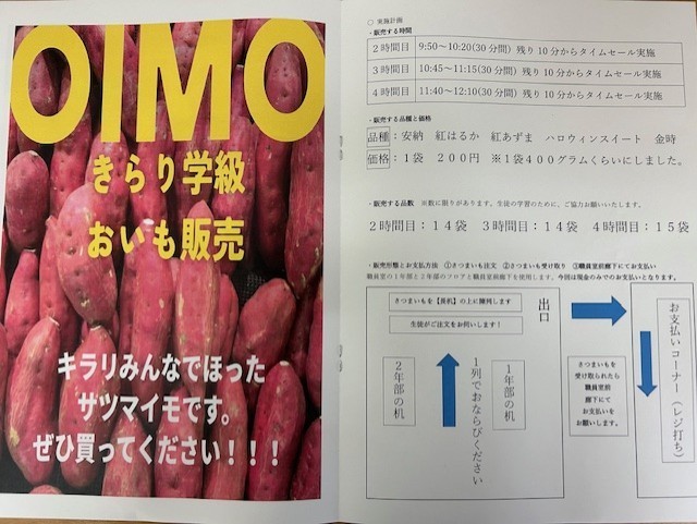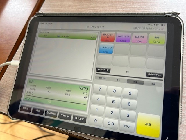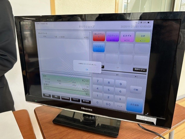 なぜ「ブラックフライデー」の話かというと、本日、11月28日(金)は「きらり」のサツマイモ販売実習が行われたのである。支払いコーナーでは、アプリを使ったレジまで登場!!本格的である。