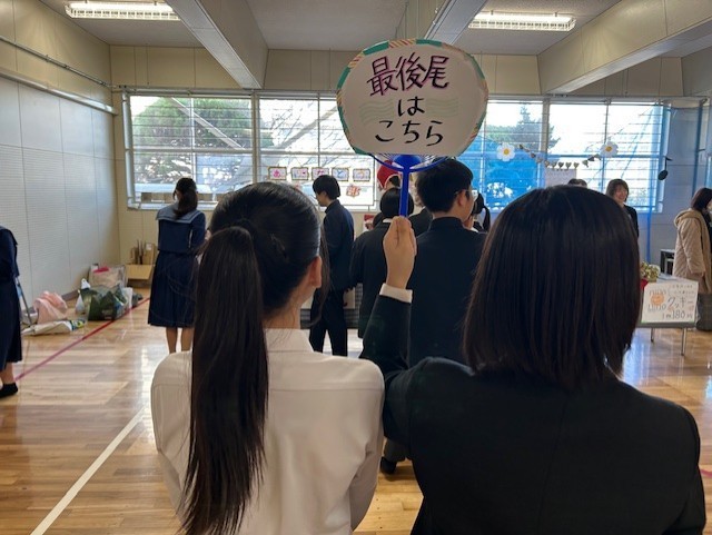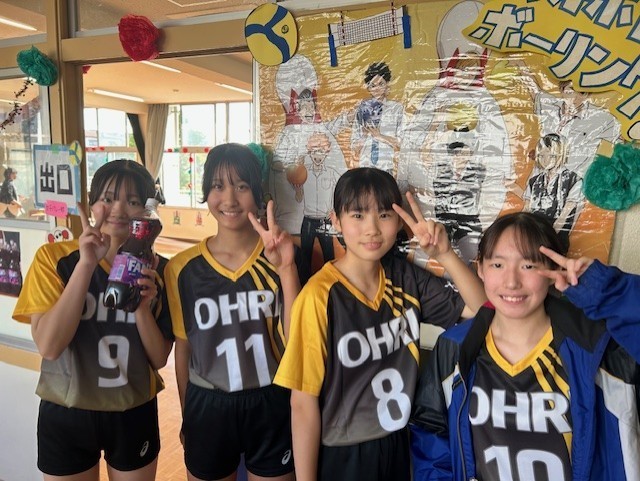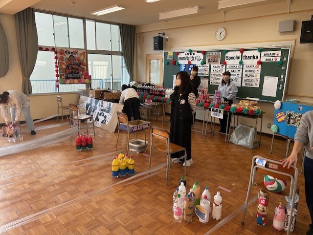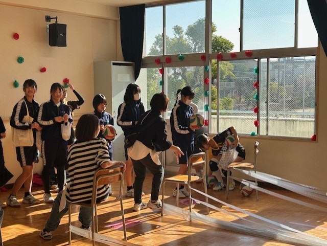女子バレーボール部の「ペットボトルボウリング」では、「倒してみらんか!!一発勝負たい!!」というコンセプトのもとペットボトルに先生たちの写真を貼って商品をかけた戦いが始まっていた…。