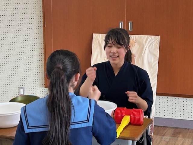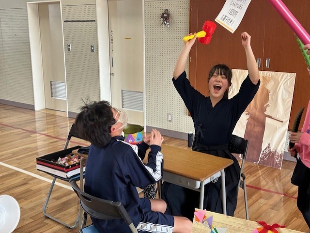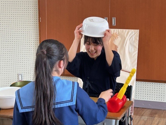 剣道部のゲームコーナーでは、「叩いて被ってじゃんけんポン」で白熱のバトルが…。