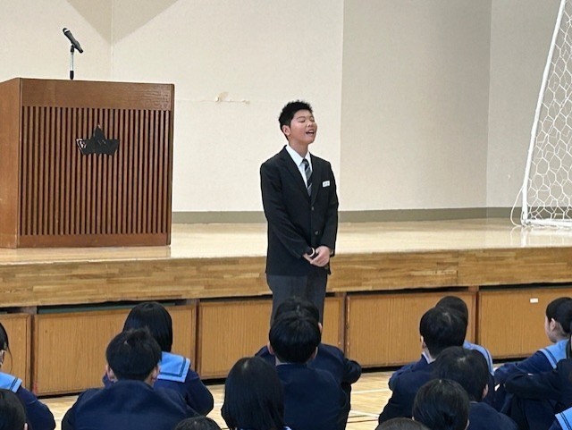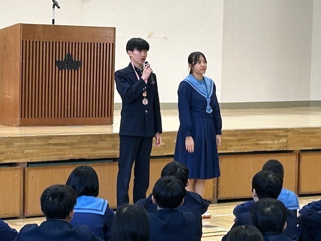 写真は、生徒会副会長と学級委員長、美化委員長、給食委員長からのあいさつと全国大会出場者の報告会の様子です。