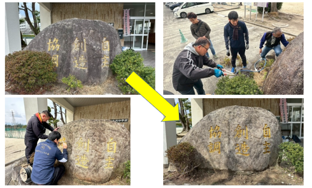 高圧洗浄機や汚れ取りの道具などを駆使して、ピカピカに修復!!さらには、校訓の文字まで金色の塗料で見事に復旧!!(@ ̄□ ̄@;)!!
