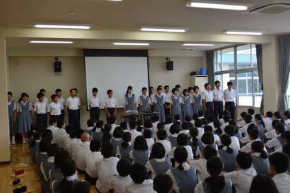 6月19日火曜日の学年集会で、修学旅行実行委員とスローガンの発表を行いました。スローガンは、「進歩〜自覚・自発・団結で築く終わりなきSTORY〜」です。これから、修学旅行までにチャイム席、忘れ物、棚の整理の点検活動を行い、まずは日常生活を向上させることに取り組んでいきます。