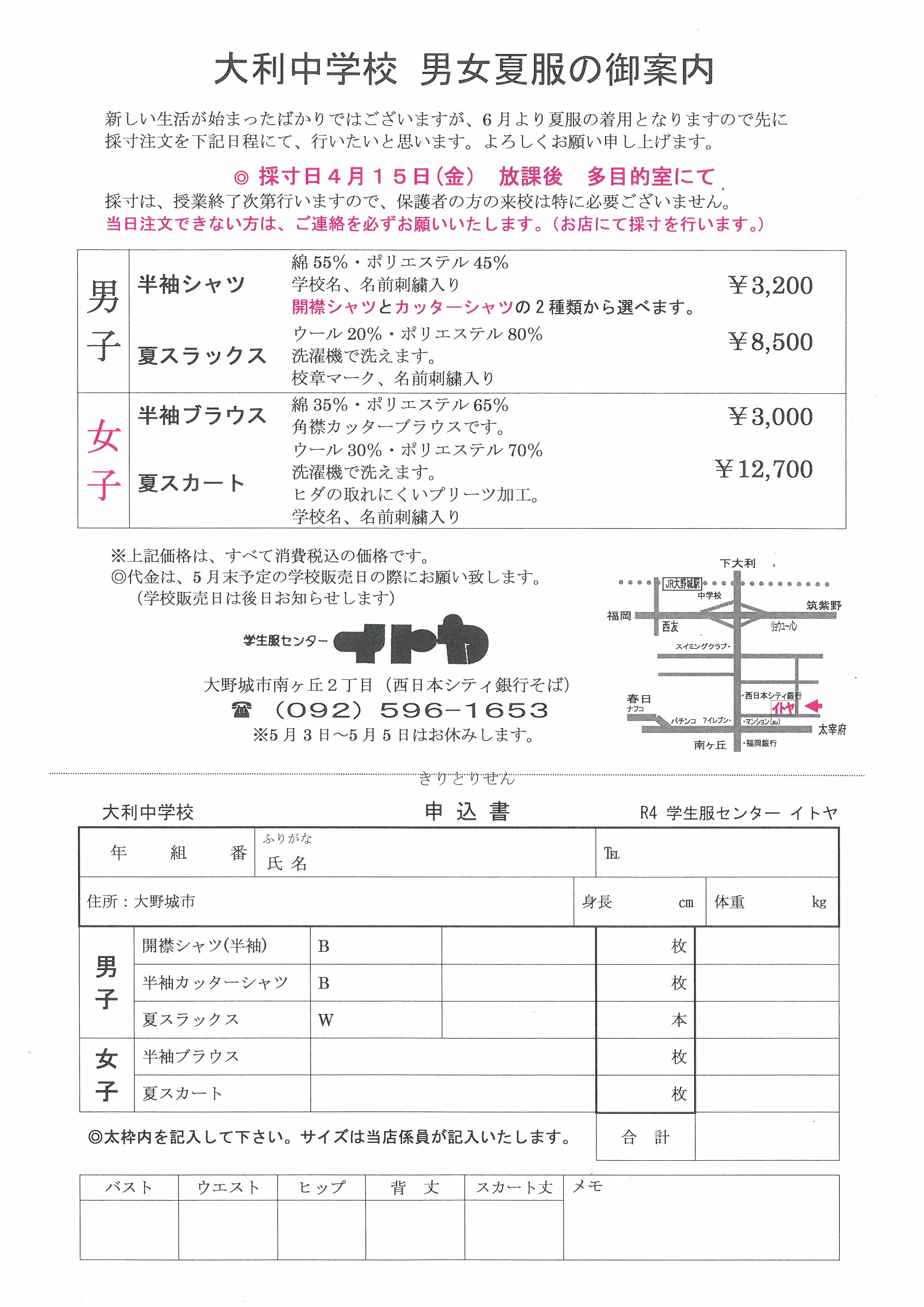 本日(4/11)、お子様に夏服採寸についての案内を配付しています。15日本校多目的室で採寸を行いますので、必要事項を記入の上、学校に持たせていただきますようお願いします。