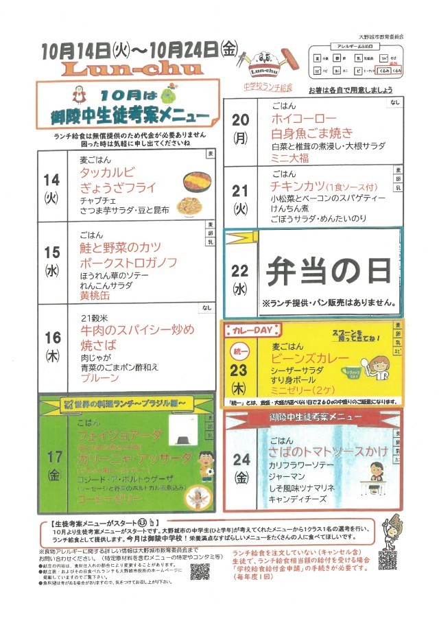 「Lun-chu」ランチ給食メニュー10月14日~10月24日