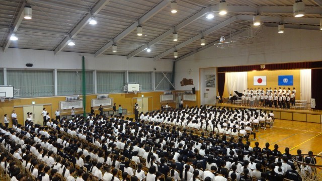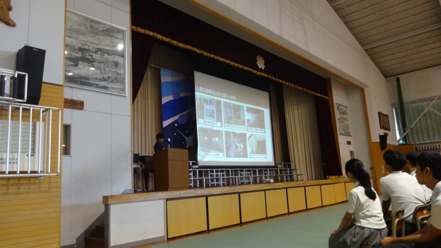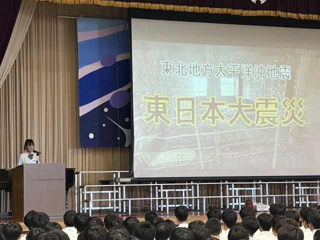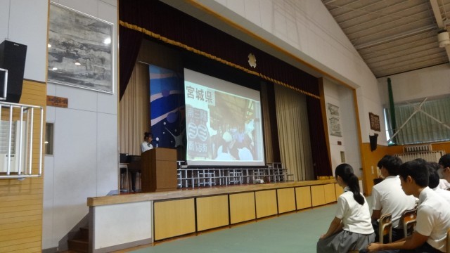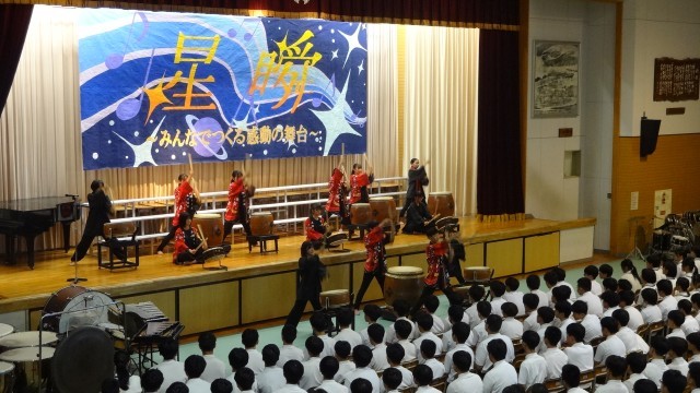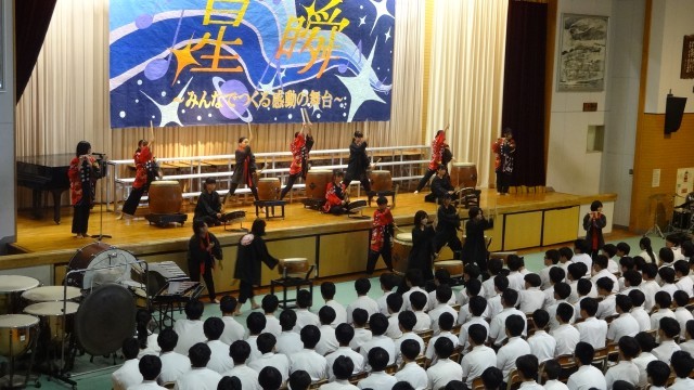 写真は、被災地派遣研修報告と光輝太鼓部の演奏の様子です。被災地派遣研修報告では、緊張しながらも全校生徒に向けて堂々と学んできたことを発表してくれました。光輝太鼓部の演奏も、聴く人を引き込んでいく迫力ある演奏を披露してくれました。