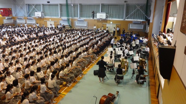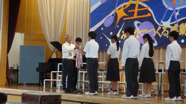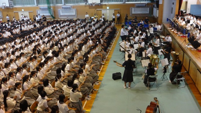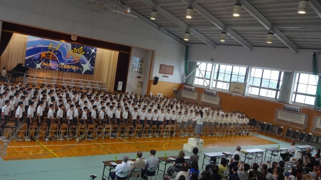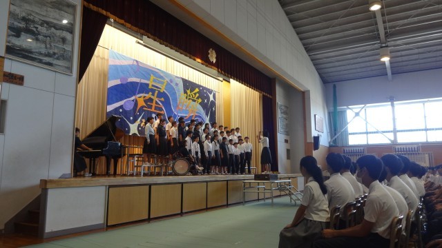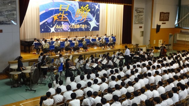 写真は、吹奏楽部の演奏と閉会式の様子です。吹奏楽部の演奏では、ダイナミックな曲やポピュラーな曲が披露され、曲に合わせて手拍子等をし、大いに盛り上がりました。閉会式では、実行委員長から「星瞬~みんなでつくる 感動の舞台~」についてこれまでの取り組みと本番を振り返りながら話がありました。その後生徒会歌「無限の未来へ」を全校で合唱しました。合唱やステージ発表は大変立派で感動的でした。このように素晴らしい2日間になったのは、実行委員長をはじめ、合唱リーダーや委員会が様々な役割を担ってくれたからです。また、放送部のみなさんのスムーズな進行があったからです。本当にありがとうございました。来週は展示見学が始まります。一人一人が全力で創り上げた作品を真剣に鑑賞して、豊かな感性をさらに高めてほしいと思います。