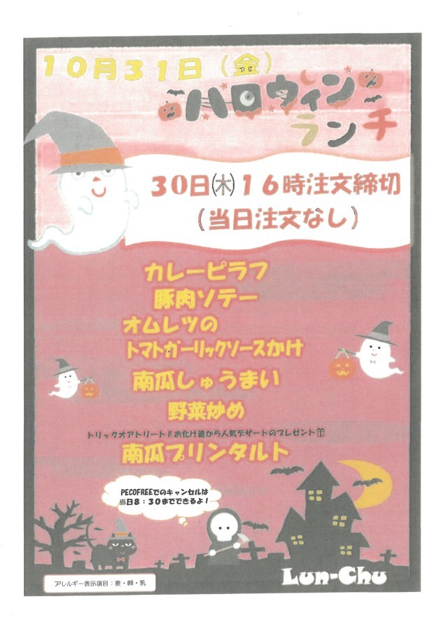 10月31日(金)ランチ給食「ハロウィンランチ」の注文は、PECOFREE、手書きとも前日30日(木)16時までとなります。当日注文はありませんので注意してください。なお、キャンセルは当日31日(金)8時30分までできます。 ハロウィンランチポスター