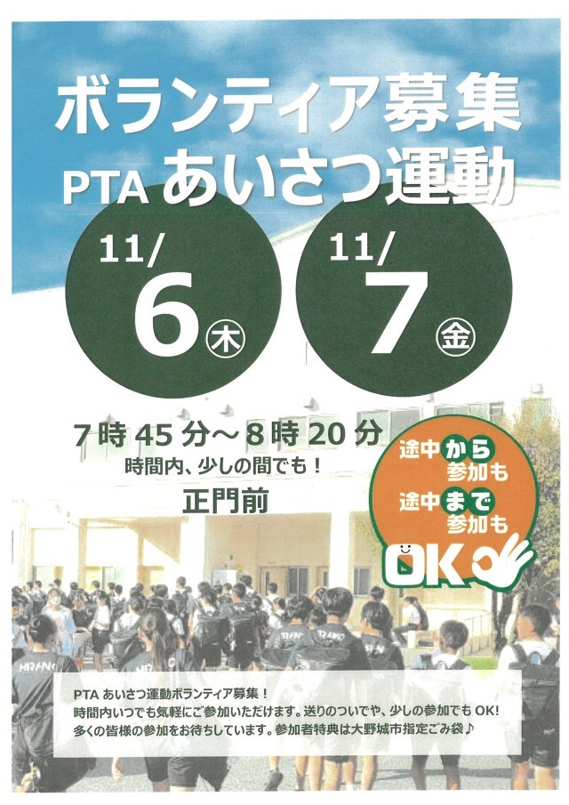 PTA活動の一環である朝のあいさつ運動を実施します。少しの参加でも構いませんので、お気軽にご参加ください。多くの保護者の皆様の参加をぜひお待ちしております。R7_あいさつ運動ボランティア募集_後期中間