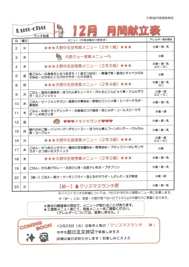 12月月間献立表を掲載していますのでご確認ください。注文は、注文方法に従って行ってください。なお、12月23日は「クリスマスランチ」で、前日注文締切です。詳細は後日お知らせがあるそうです。12月月間献立表