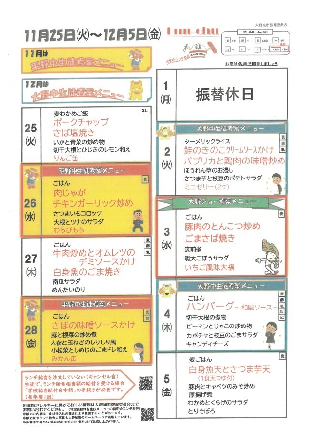 「Lun-chu」ランチ給食メニュー11月25日(火)から約2週間分を載せています。29日(土)は、市民総ぐるみ防災訓練等で学校はありますが、ランチ給食と牛乳の提供はありません。また、パン給食はありますが、前日お昼休みまでの注文ですので忘れないようにしてください。12月からは大野中学校の生徒さん考案メニューです。 11月25日~2週間メニュー