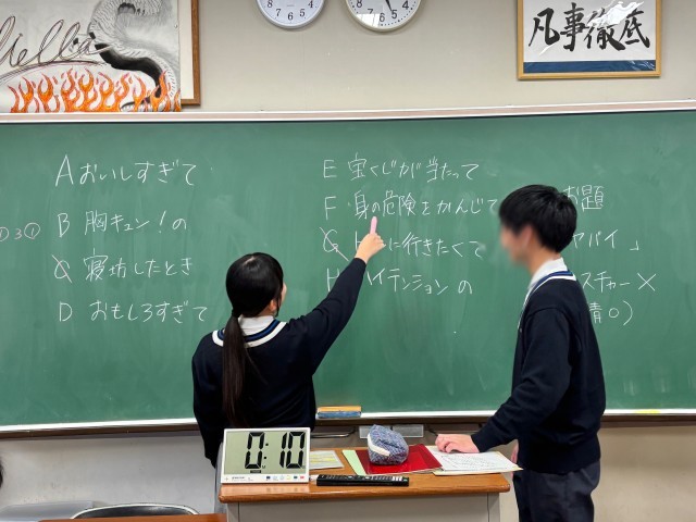 令和7年11月26日(水)帰りの会に学級委員会の取り組みでクラスメイト同士の絆を深めるためのグループワーク(ミニゲーム)を行いました。具体的には、「はぁっていうゲーム」を班対抗で行いました。演技力抜群の新しい一面を見せたクラスメイトに盛り上がりの10分間でした。