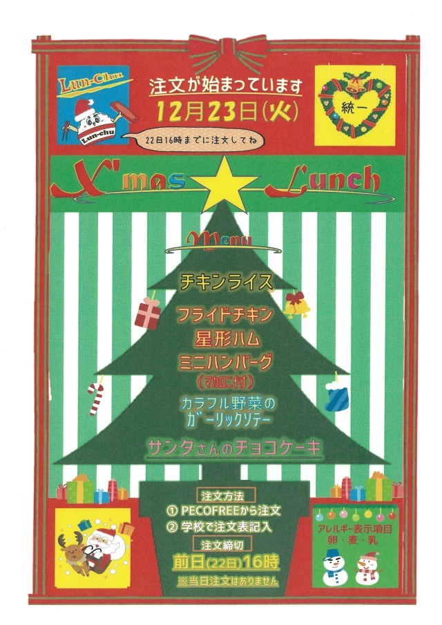 12月23日(火)ランチ給食「クリスマスランチ」の注文は、PECOFREE、学校で注文票記入とも前日22日(月)16時までとなります。当日注文はありませんので注意してください。 12月23日クリスマスランチポスター